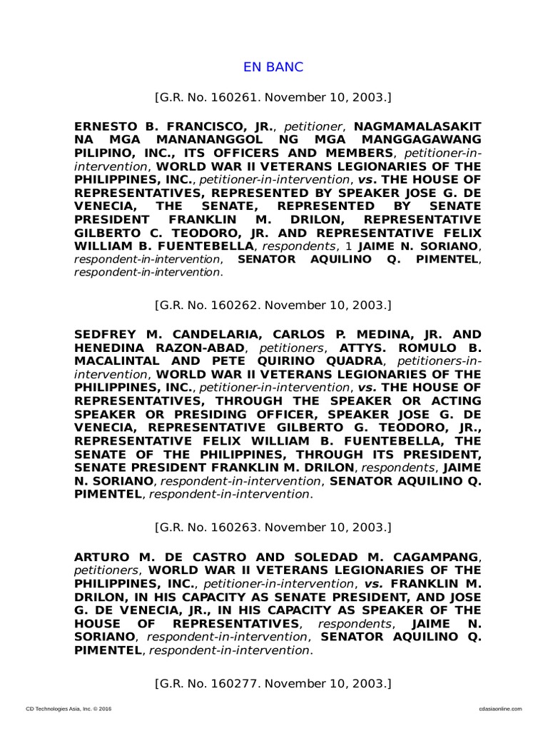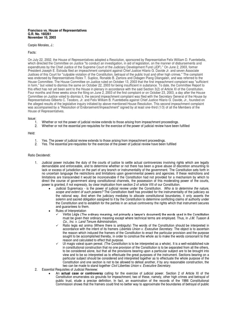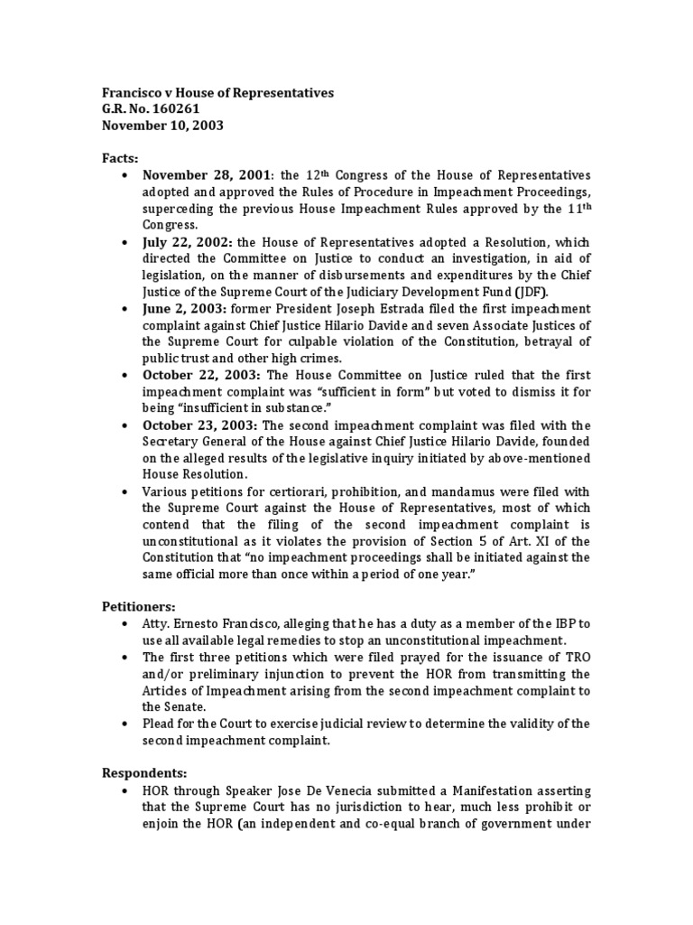 CONSTI 1 Francisco v. House or Rep., G.R. No. 160261, Nov ... from imgv2-1-f.scribdassets.comFrancisco Vs House Of Representatives The 23 marble relief portraits over the gallery doors of the house chamber in the u.s. The number of districts in each state is determined by a state's population. Military vans, buses and police cars pulled up to the white house, loaded passengers, took them down the road and across a bridge and then some vans came back empty to. On 28 november 2001, the 12th congress of the house of representatives adopted and approved the rules of procedure in impeachment. On 22 july 2002, the house of representatives adopted a resolution, which directed the committee on justice to conduct an investigation, in aid of legislation, on the manner of disbursements and expenditures by the chief justice of the supreme court of the judiciary development fund (jdf). The house is currently made the system of house representation based on district population was part of the great compromise of the constitutional convention in 1787, which. Judicial review and separation of powers; The house and senate have evolved into very different bodies.