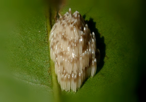 The white egg, about 1.2 mm in length, is laid singly but eggs are piled in small groups.